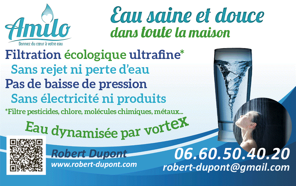 Cartes de visite Amilo dimension 85 x 55 mm fond blanc, recto, orientée filtration habitation. Papier haut de gamme 300 g/m² mat ou brillant. Contient un QR code à flasher pour arriver directement sur votre site ou shop Amilo.