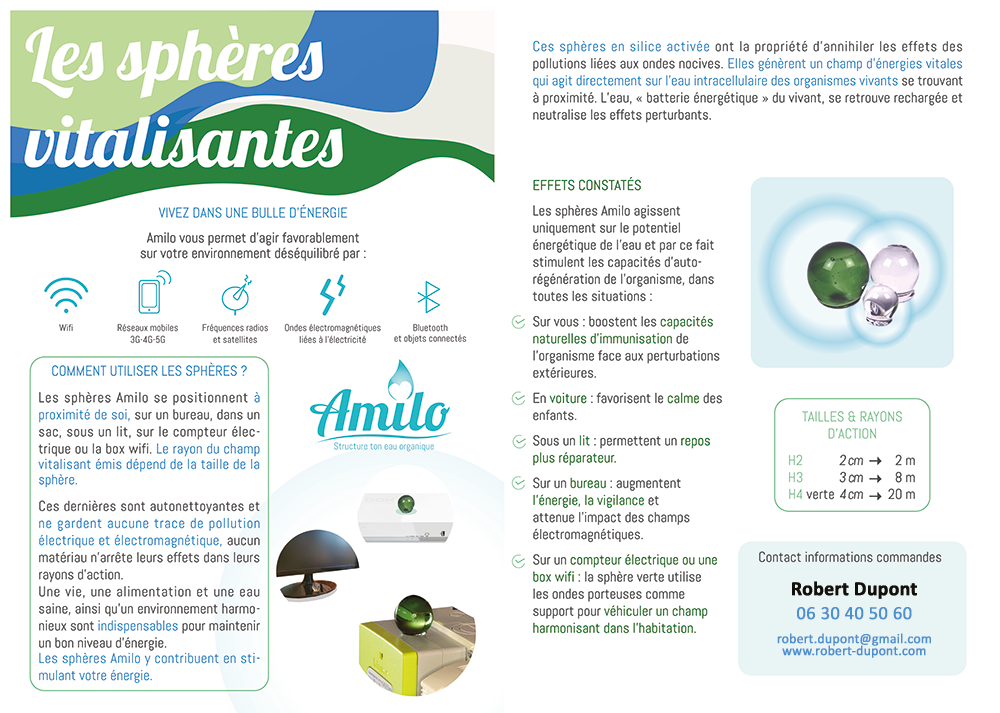 Flyer A5 Amilo sphères Harmonie recto/verso. Papier et quantités au choix. Les prix comprennent : personnalisation de vos données, impression et livraison chez vous.